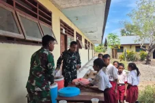 Satgas Pamtas RI-RDTL Sektor Barat Yonarhanud 2 Kostrad Berbagi Kacang Hijau di SD Netemnanu Utara