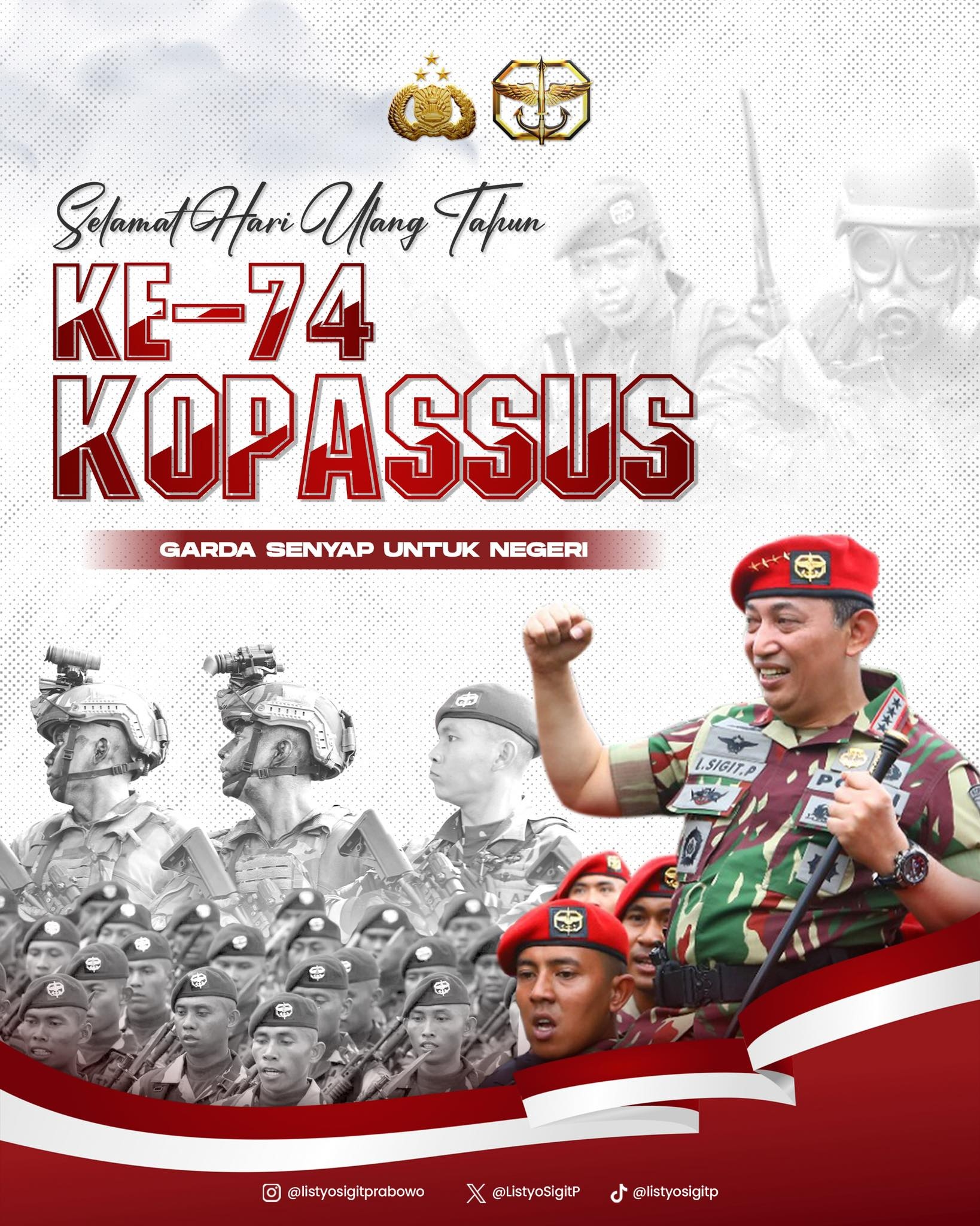 Ucapan tersebut disampaikan Kapolri melalui akun Instagram pribadinya @listyosigitprabowo sebagai bentuk apresiasi atas dedikasi, profesionalisme, dan ketangguhan Kopassus dalam menjaga kedaulatan serta keutuhan Negara Kesatuan Republik Indonesia. “Kopassus senantiasa hadir dengan dedikasi tinggi, profesionalisme, dan ketangguhan dalam menjaga kedaulatan serta keutuhan NKRI,” tulis Kapolri.