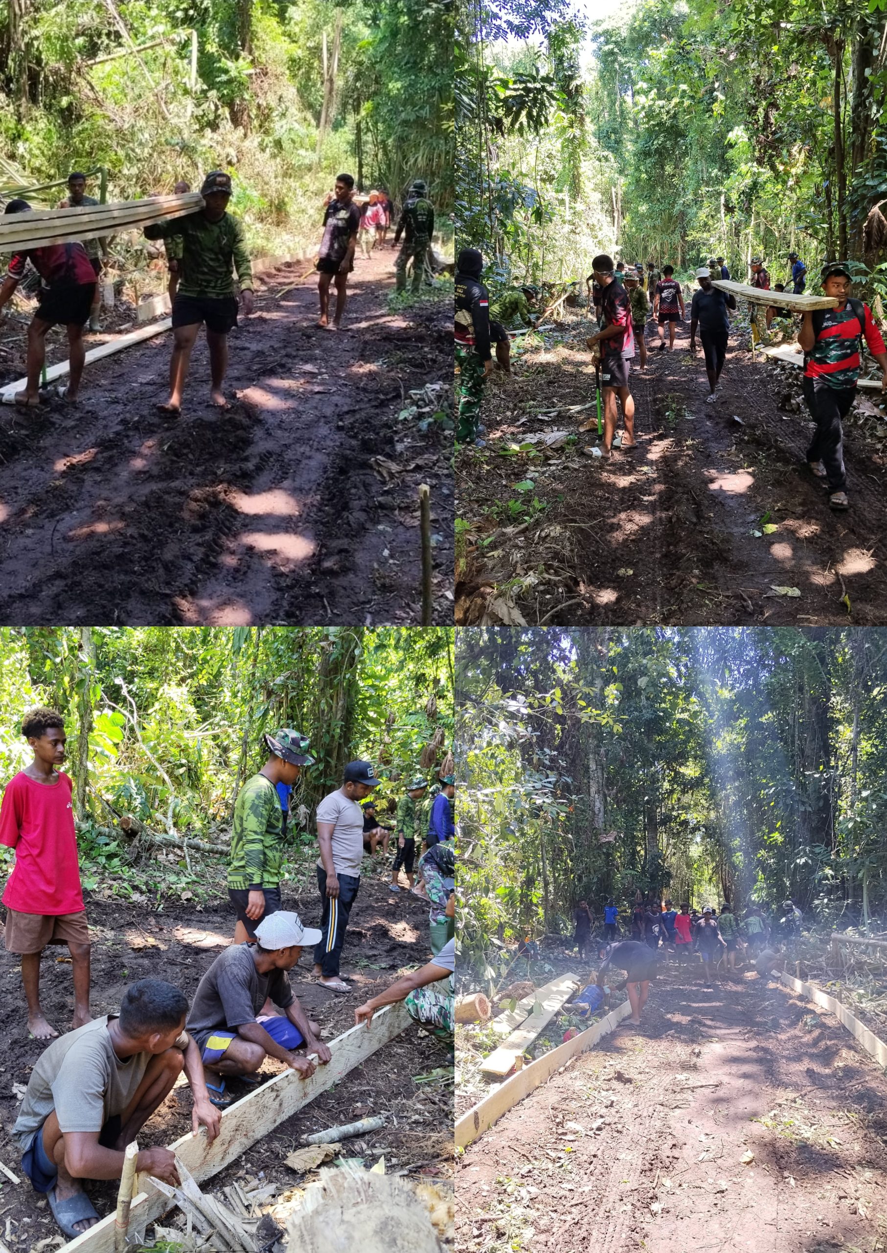 MII – Manokowari Utara – Semangat gotong royong kembali terlihat nyata di tempat. Anggota Satgas TMMD Ke-128 Kodim 1801 / Manokwari bahu-membahu bersama warga Kampung Tanah Rubuh dalam membuat mal atau cetakan yang akan digunakan untuk pengecoran jalan di Kampung Tanah Rubuh, Distrik Manokwari Utara, Kabupaten Manokwari, Senin (27/4/26).